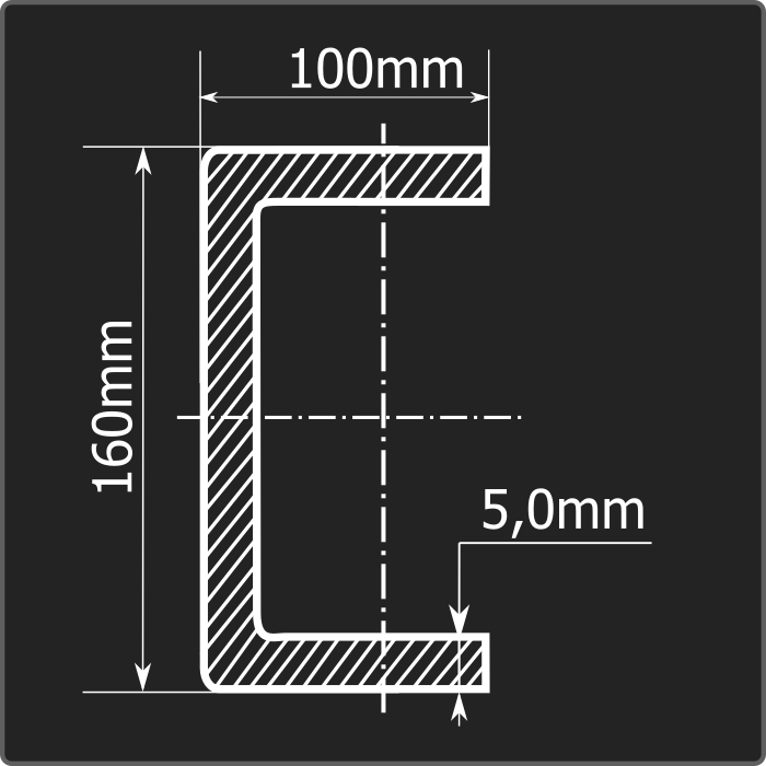 Швеллер стальной холоднокатаный гнутый равнополочный 160*100мм, толщиной 5,0мм и длиной 12м. Материал - углеродистая сталь. Соответствует требованиям ГОСТ 8278-83.