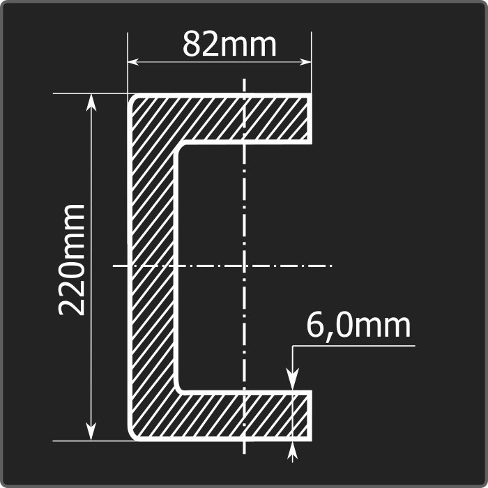 Швеллер стальной холоднокатаный гнутый равнополочный 220*82мм, толщиной 6,0мм и длиной 12м. Материал - углеродистая сталь. Соответствует требованиям ГОСТ 8278-83.