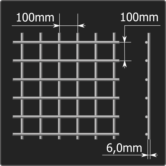 Сетка сварная арматурная с размером стороны ячейки 100*100мм изготовлена из арматурной стали диаметром 6,0мм шириной карты  2,0м и длиной 3,0м.
