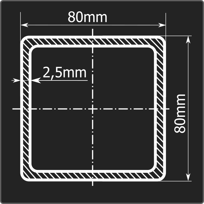 Труба профильная стальная квадратного сечения 80*80мм, длиной 6м и толщиной 2,5мм. Материал - углеродистая сталь. Соответствует требованиям ГОСТ 13663-86. Стандартный пакет: вес - 2,304тн., количество - 64шт.